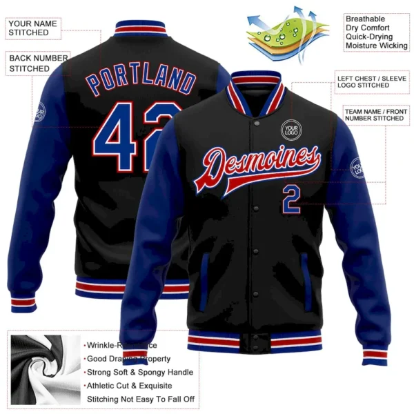 Be the first to review “Custom Black Royal-Red Bomber Full-Snap Varsity Letterman Two Tone Jacket” Cancel reply
