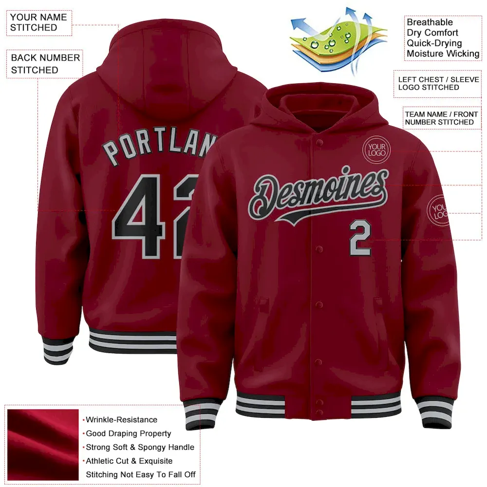 Be the first to review “Custom Crimson Black-Gray Bomber Full-Snap Varsity Letterman Hoodie Jacket” Cancel reply