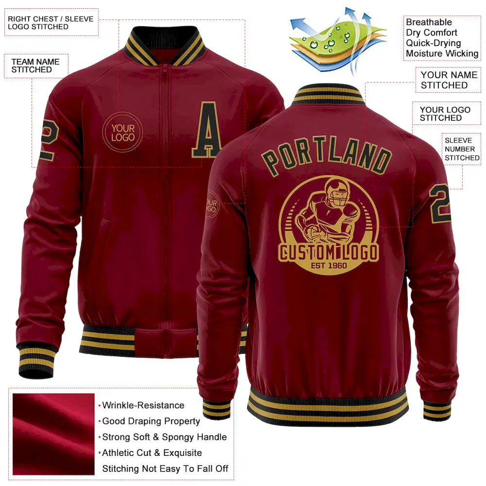 Be the first to review “Custom Crimson Black-Old Gold Bomber Varsity Letterman Zipper Jacket” Cancel reply