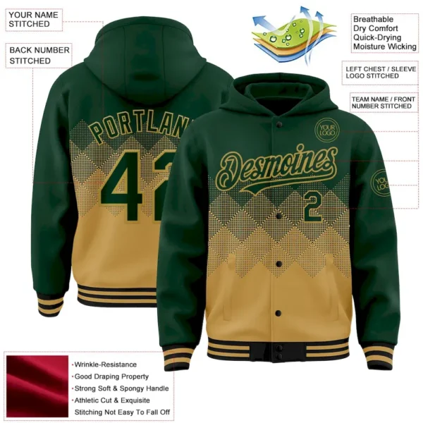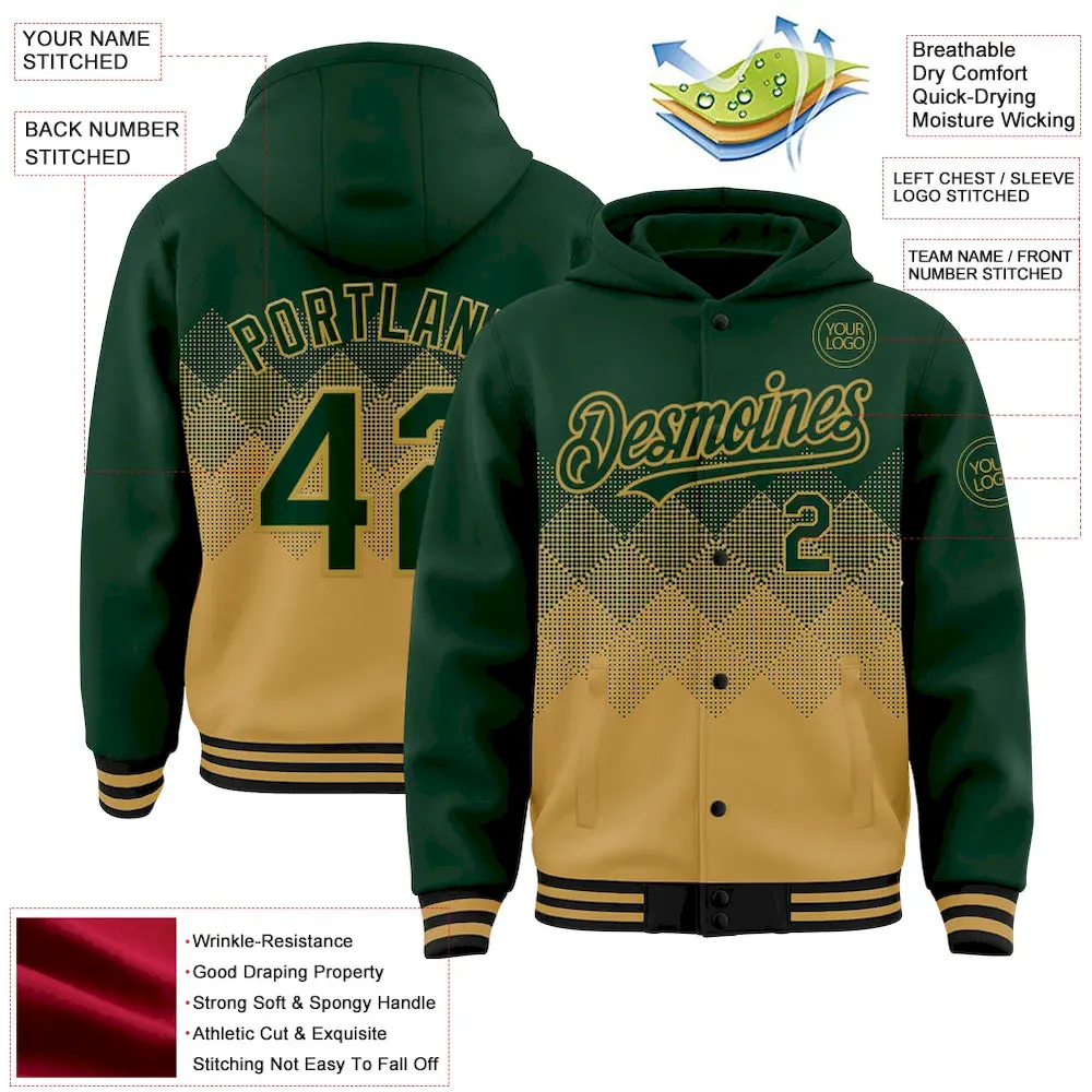 Be the first to review “Custom Green Old Gold-Black Gradient Square Shape 3D Pattern Design Bomber Full-Snap Varsity Letterman Hoodie Jacket” Cancel reply