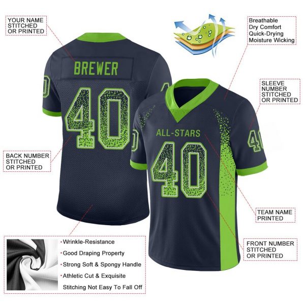 Be the first to review “Custom Navy Neon Green-Gray Mesh Drift Fashion Football Jersey” Cancel reply