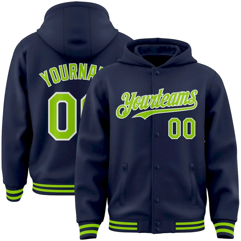 Be the first to review “Custom Navy Neon Green-White Bomber Full-Snap Varsity Letterman Hoodie Jacket” Cancel reply