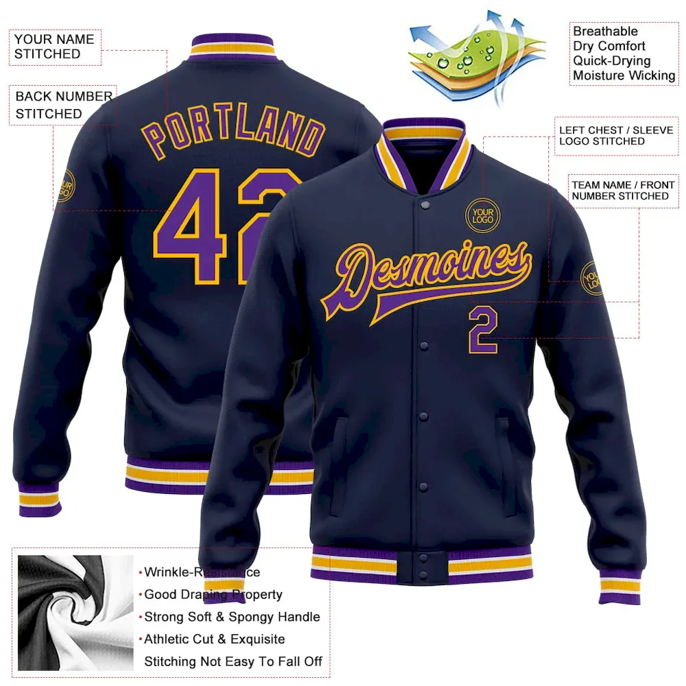 Custom Navy Purple-Gold Bomber Full-Snap Varsity Letterman Jacket