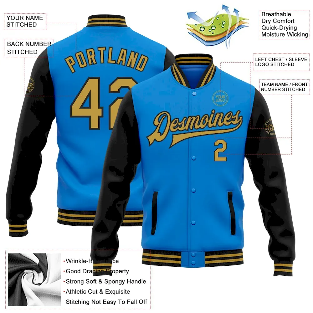 Be the first to review “Custom Powder Blue Old Gold-Black Bomber Full-Snap Varsity Letterman Two Tone Jacket” Cancel reply