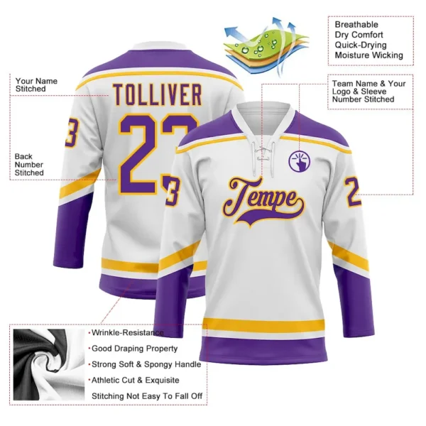 Be the first to review “Custom White Purple-Gold Hockey Lace Neck Jersey” Cancel reply