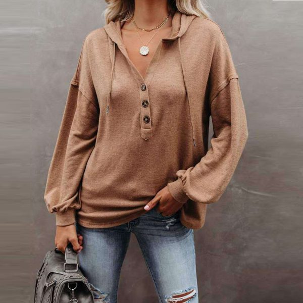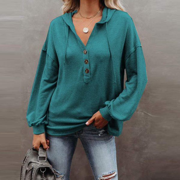 Women’s Solid Color V-Neck Button Hooded Loose Long Sleeve Sweatshirt