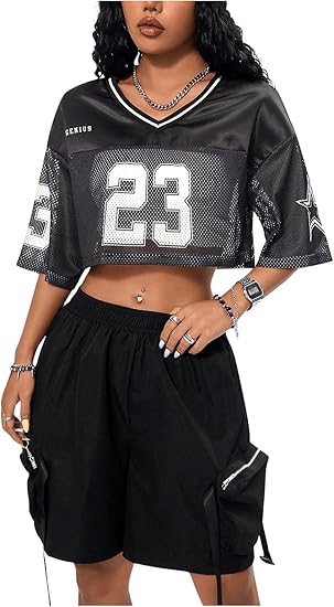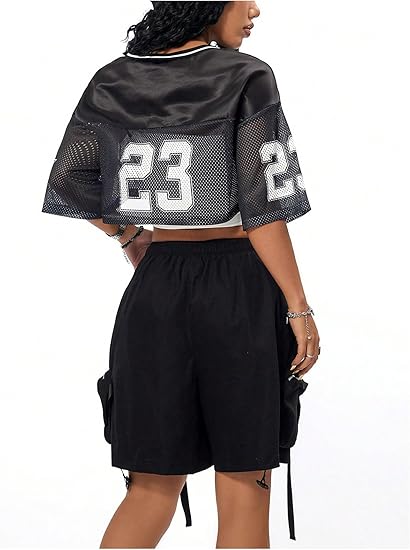 Women’s Jersey Shirts Hip Hop V Neck Short Sleeve Mesh Crop Top Graphic Tees
