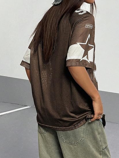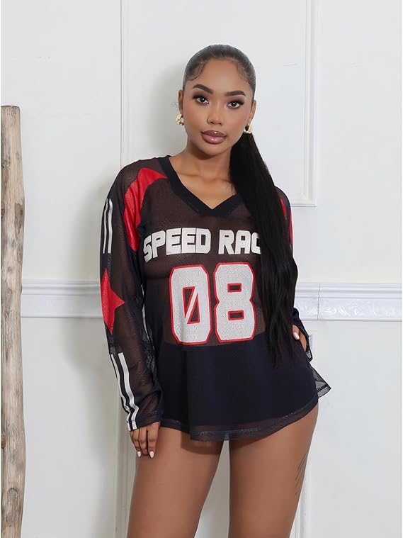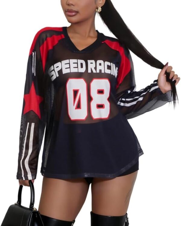 Jersey Shirts for Women – Mesh Long Sleeve Tops Sheer Blouse Graphic Tees Casual Party Club Y2k Streetwear