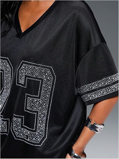 Women’s Rhinestone Jersey Shirts Number Graphic V Neck Half Sleeve Loose Tops Streetwear