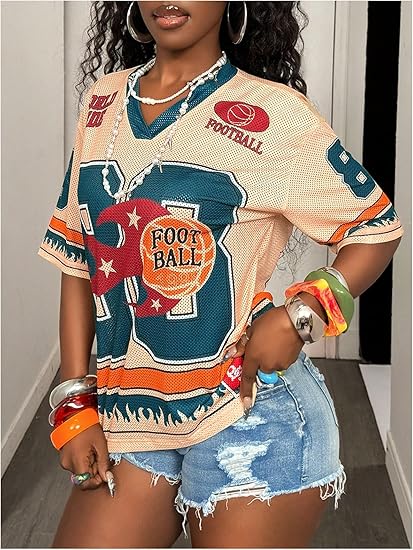 Women’s Graphic Football Jersey Top V Neck Short Sleeve Loose T Shirt Streetwear