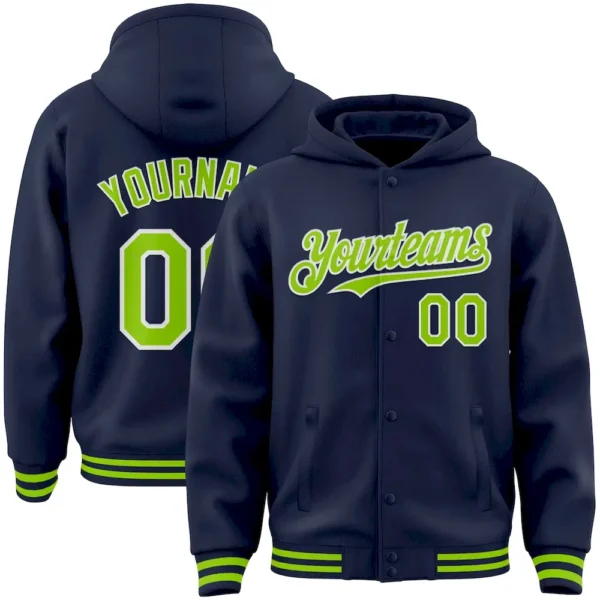 Custom Navy Neon Green-White Bomber Full-Snap Varsity Letterman Hoodie Jacket