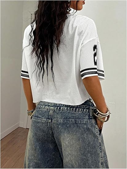 Women’s Y2k Jersey Shirt Lace Mesh Number Graphic Tees V Neck Half Sleeve Summer Crop Tops Streetwear