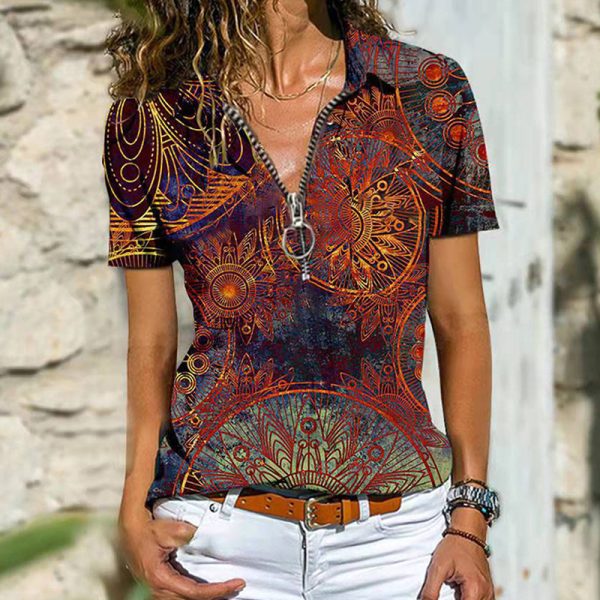 Spring And Summer Bohemian Ethnic Zip Short Sleeve Women’s T-Shirt