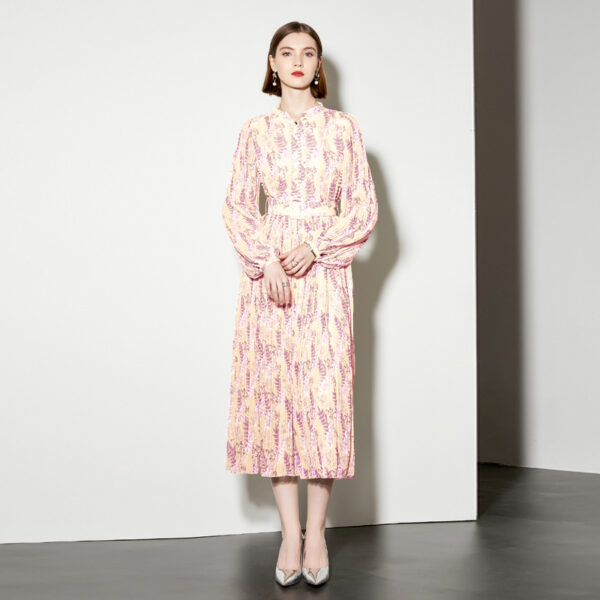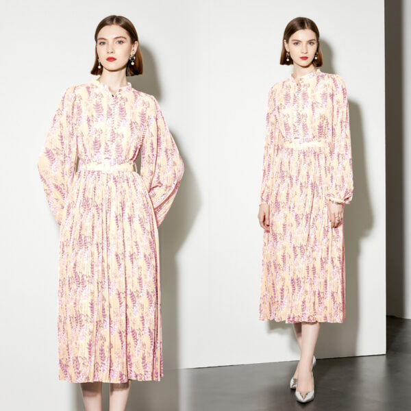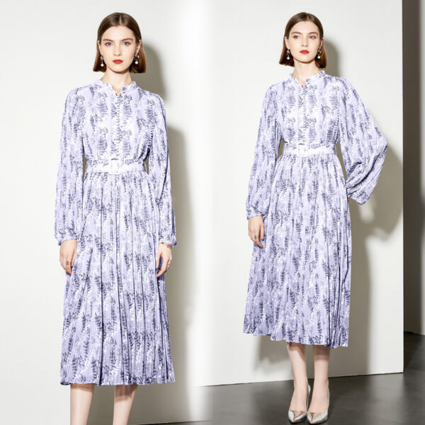 Pleated lantern sleeve belt spring dress