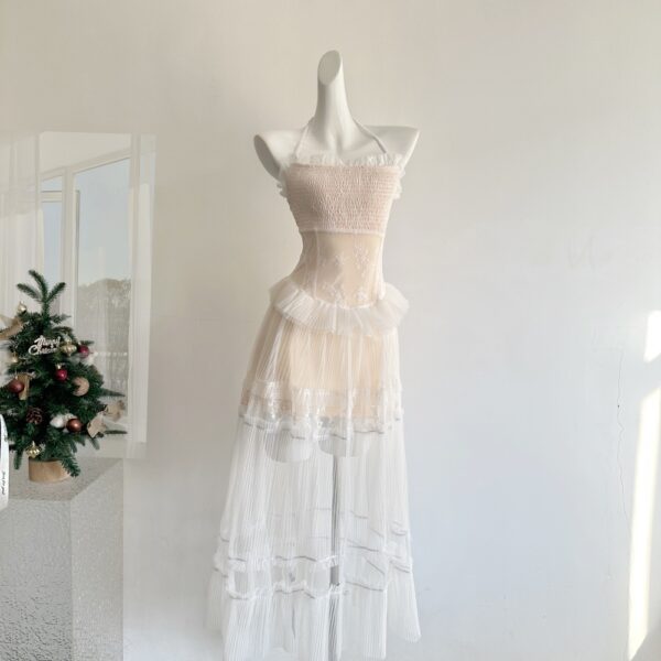 Printing halter splice jacquard long lace lady dress