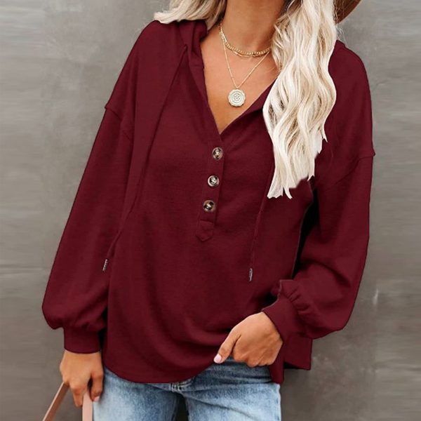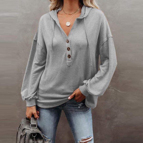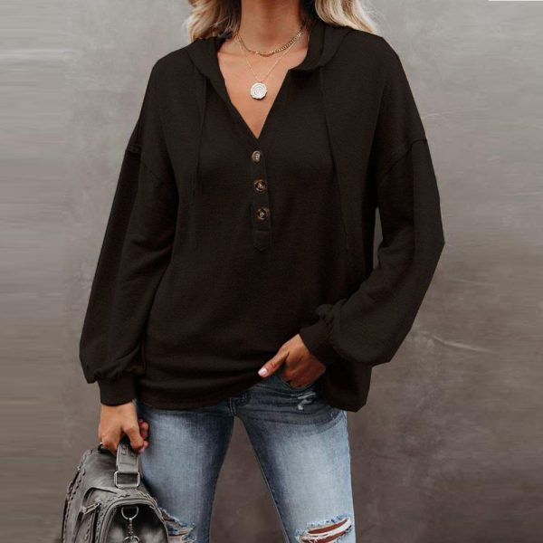 Women’s Solid Color V-Neck Button Hooded Loose Long Sleeve Sweatshirt